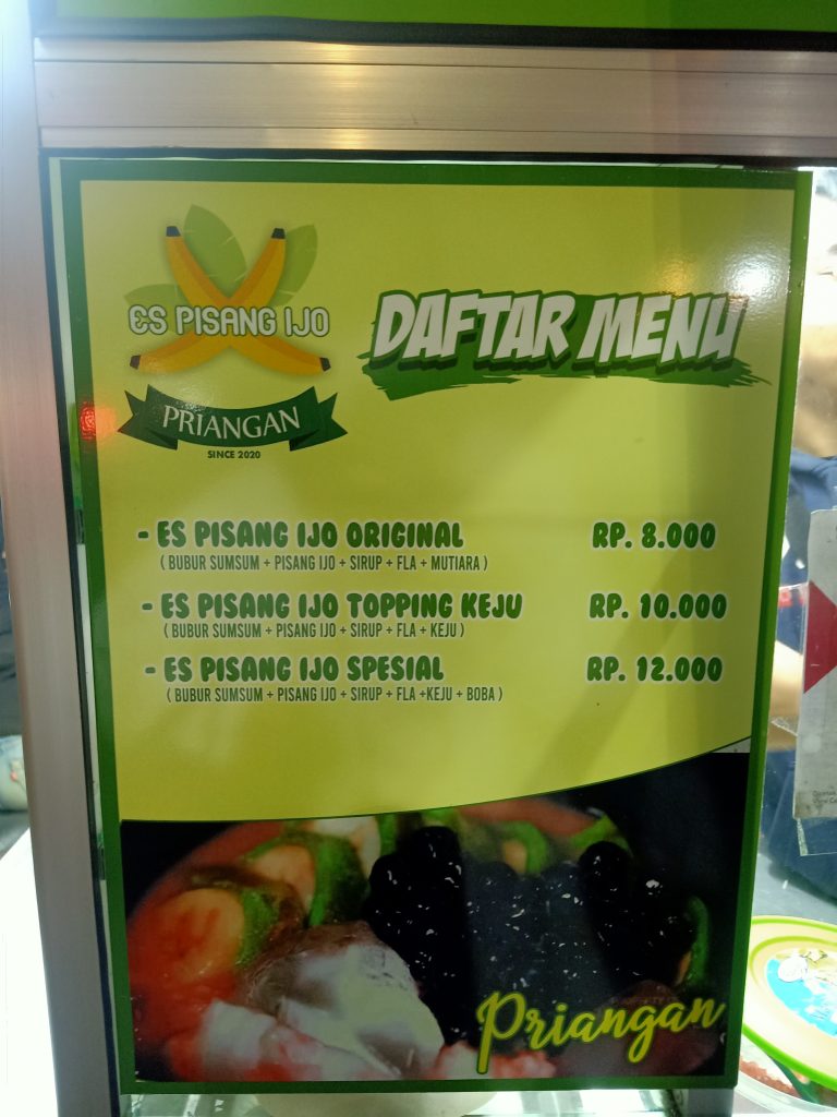 Dengan tampilannya yang unik dan berwarna cerah menjadi pemikat bagi orang yang ingin mencobanya. Selain itu, perkembangan zaman membuat topping es pisang ijo berinovasi. Topping dari es pisang ijo Bandung yang bisa Anda coba ada keju dan Boba. Sehingga, mampu membuat Anda bingung ingin mencoba yang mana. Karena kedua topping tersebut sangat lezat dan melengkapi.